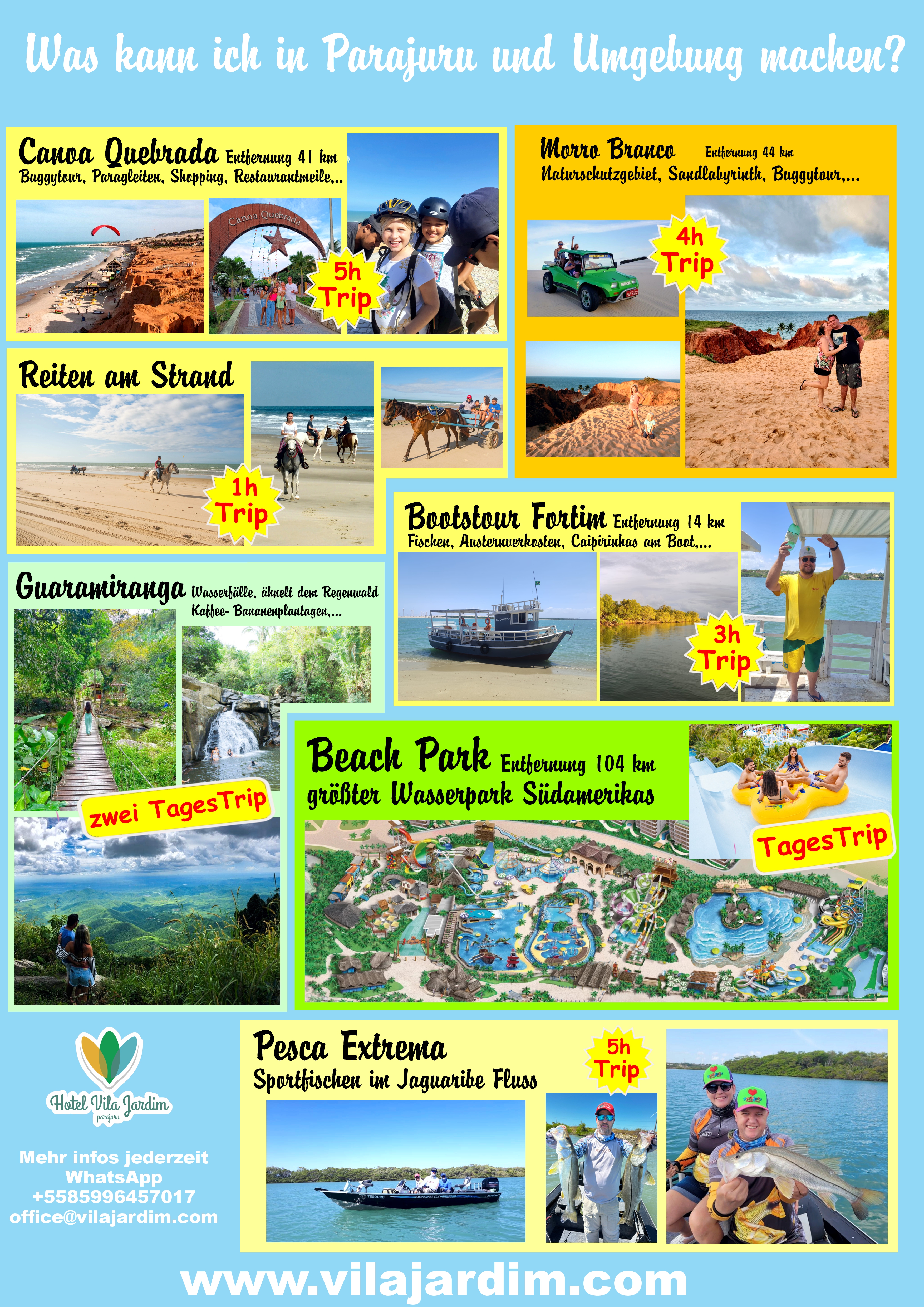 Buggy TripDer Nordosten Brasiliens ist nicht nur bekannt für die schönsten Strände Brasiliens, sondern auch für seine gigantischen Dünen. Das Hotel Vila Jardim in Parajuru bietet Auflüge, bei denen ihr das Land der atemberaubenden Dünen und Lagunen mit dem Buggy erleben könnt. |